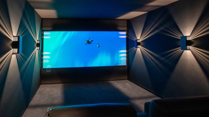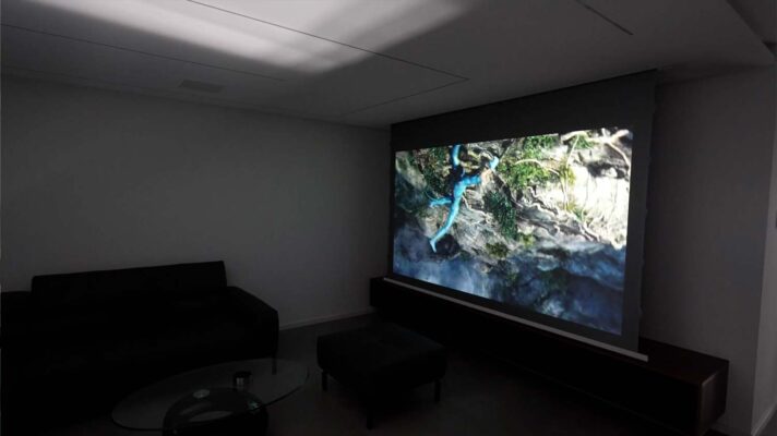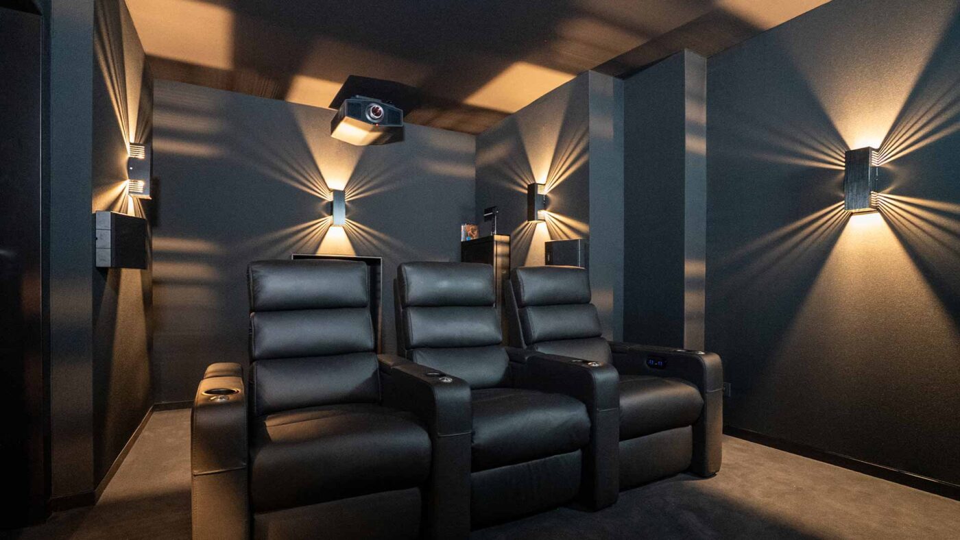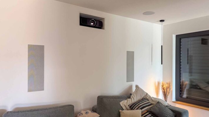 Wir haben ein modernes Wohnzimmer in ein vollwertiges Heimkino verwandelt – stilvoll integriert, technisch durchdacht und ohne das wohnliche Ambiente zu stören. Von der ersten Planungsphase bis zur finalen Umsetzung wurde jeder Schritt sorgfältig auf die Architektur und das Design des Raumes abgestimmt. Herzstück ist eine akustisch transparente, rahmenlos integrierte Screenline-Leinwand, die sich dezent in den Wohnbereich einfügt. Das 5.1.2 Dolby Atmos Soundsystem von DALI sorgt für ein immersives Klangerlebnis, während ein unauffällig platzierter Epson-Projektor brillante Bilder liefert. Die gesamte Technik wird zentral über ein im Untergeschoss untergebrachtes Rack gesteuert, verbunden mit einem leistungsstarken Profi-Netzwerk, das flächendeckend stabiles WLAN garantiert. Dank der Control4-Steuerung mit KNX-Anbindung lassen sich Licht, Ton, Bild und weitere Funktionen bequem bedienen. Ergänzt wird das System durch eine MultiRoom Audio Lösung, die Musik in jedem Raum ermöglicht – für Entertainment, das sich nahtlos in den Alltag einfügt.
